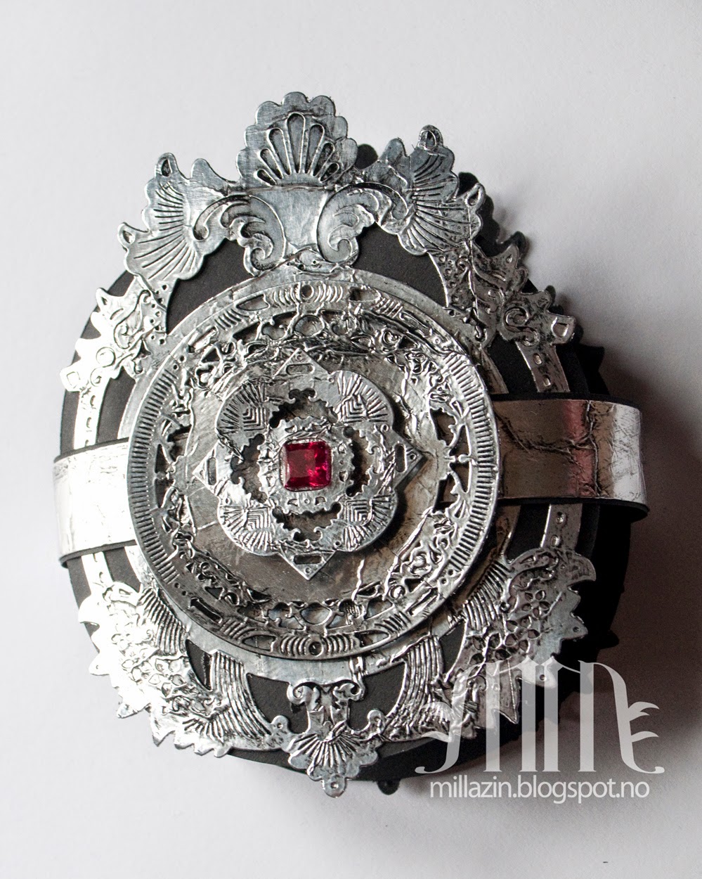 These are made by recycled carton, metal tape, acrylic paint and alcohol ink. And embellishment of paper and metal. They are colored with alcohol ink sepia and coffee.